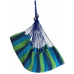 Hamac suspendu Rennes aux couleurs bleues et vert, sa matière est spécialement conçu et étudié pour résister à la pluie et aux rayons U.V du soleil. idéal pour se relaxer en tout quiétude, lire un livre au fond du jardin, il trouvera aussi bien sa place en extérieur comme en intérieur accroché à une poutre ou sur l'un de nos pieds pour hamac.